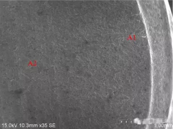 圖6~8所示為A區(qū)形貌,可見該區(qū)斷口靠近邊緣(A1區(qū))存在輪輻狀臺階,微觀可見磨損痕跡,靠近芯部(A2區(qū))可見疲勞輝紋。